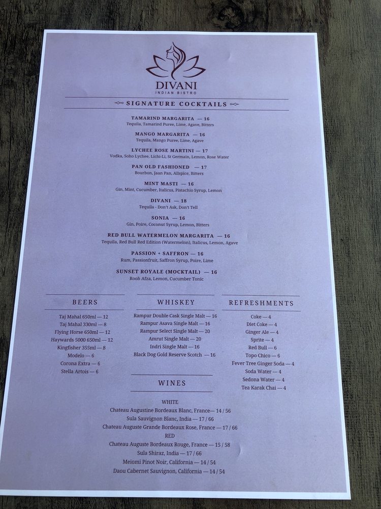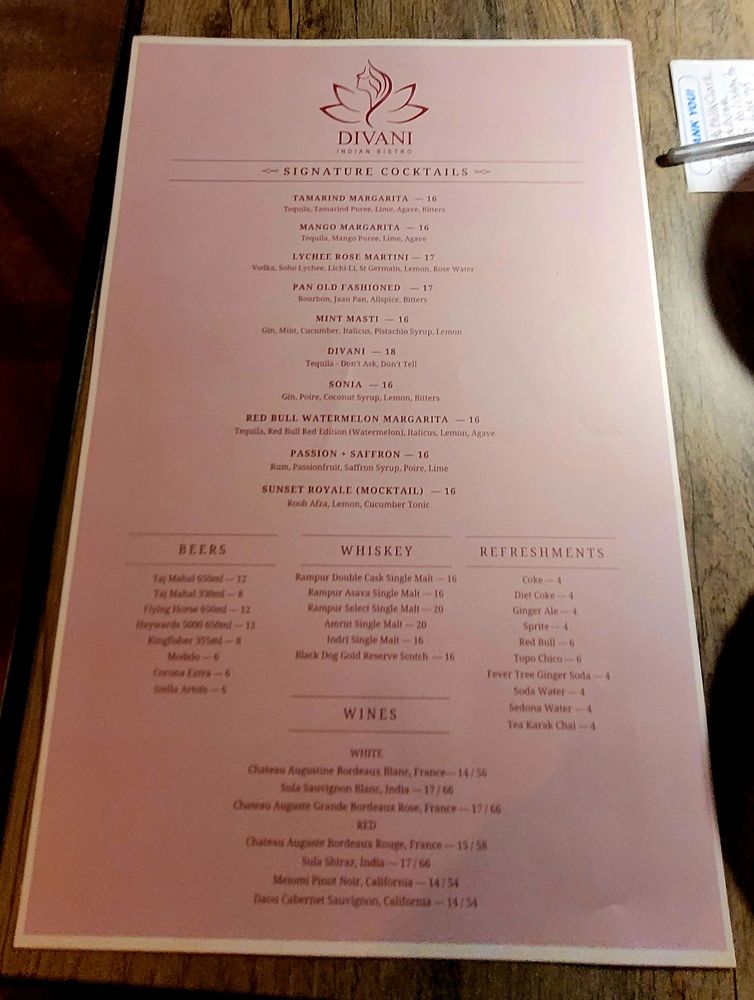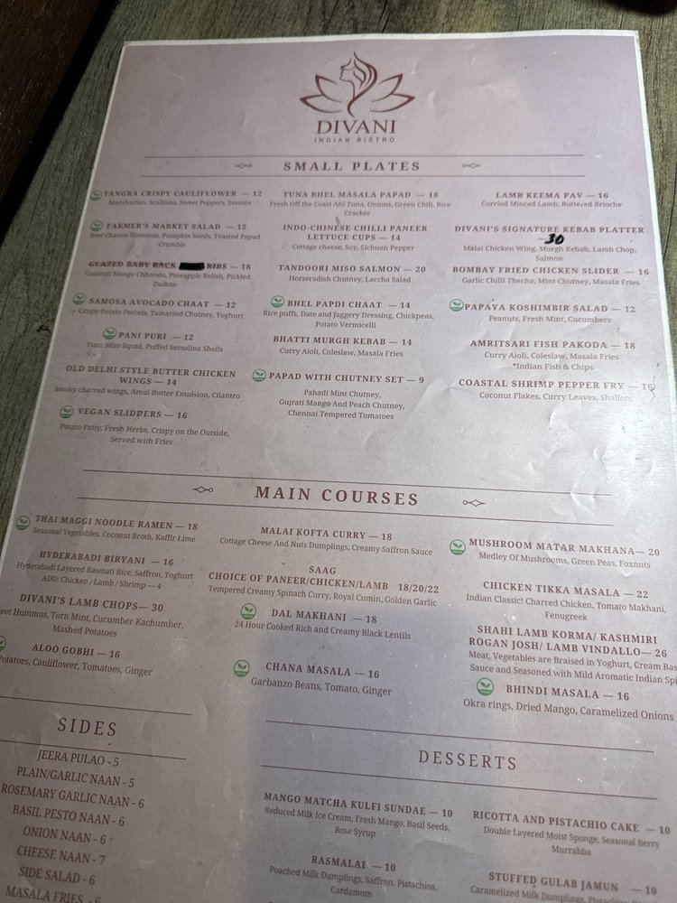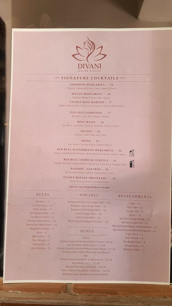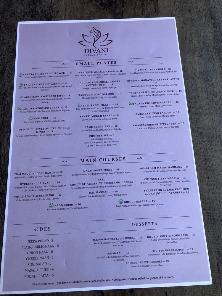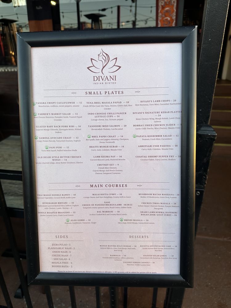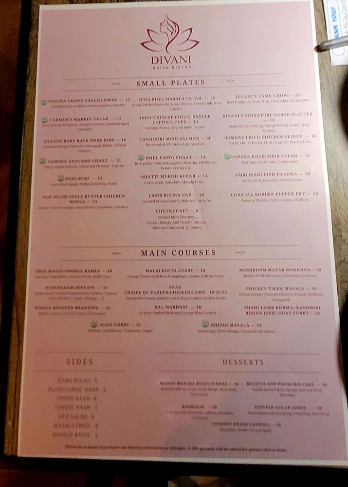 "Introducing the menu at Divani Indian Bistro, a Halal restaurant located at 20 Washington Blvd Marina del Rey, CA. Offering a variety of vegetarian options, this bistro provides a range of flavorful dishes such as Aloo Gobhi, Bhindi Masala, Chicken Tikka Masala, Dal Makhani, and Hyderabadi Biryani. The small plates menu includes options like Amritsari Fish Pakoda, Bhatti Murgh Kebab, Bhel Papdi Chaat, Bombay Fried Chicken Slider, and Chutney Set. Sides like Boondi Raita, Cheese Naan, Jeera Pulao, Masala Fries, Naan, Onion Naan, and Side Salad complement the mains and small plates perfectly. Customers praise the warm and cozy ambiance, friendly service, and authentic Punjabi flavors. With top-notch service and delicious offerings, Divani Indian Bistro is a must-visit for Indian food enthusiasts."